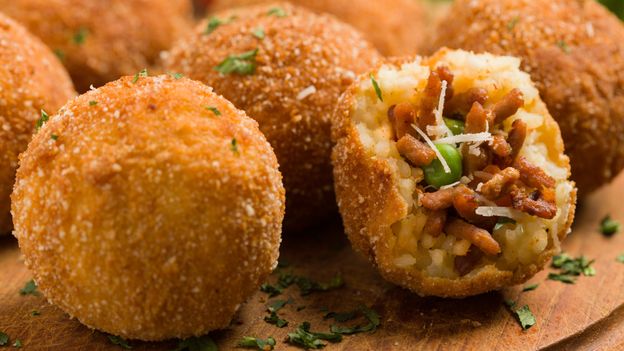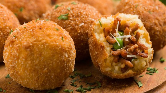 Arancini to ryżowe kulki nadziane mozzarellą. Danie pochodzi z gorącej Sycylii. Bazą jest risotto. Po wystudzeniu formuje się z niego kulki i nadziewa farszem. Kulki panierujemy w jajku i bułce tartej. Potem smażymy je w głębokim tłuszczu, aż staną się złociste i chrupiące. Ich nazwa pochodzi od słowa "arancia", co po włosku znaczy "pomarańcza". Zazwyczaj arancini przygotowuje się z wytrawnym farszem z mięsa groszku i mozzarelli, ale wariantów jest znacznie więcej. Zobacz film.