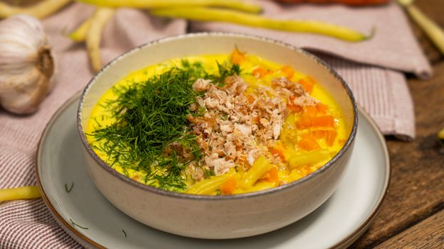 - Dodaj fasolkę, por i przyprawy, gotuj do miękkości. Na koniec zahartuj serek i śmietanę, wlej do zupy i zamieszaj, zagotuj. Podawaj z koperkiem.