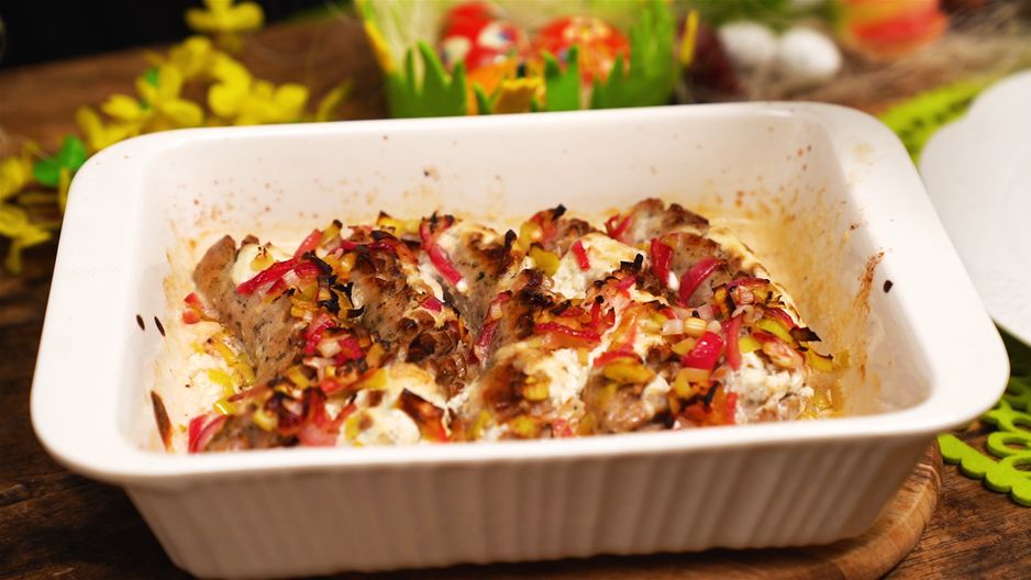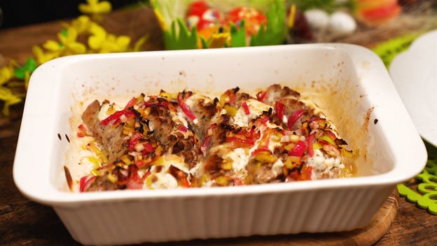 Pieczona biała kiełbasa to klasyk, ale jeśli dodasz do niej czerwoną cebulę i pora, a także zalejesz masą śmietanowo-chrzanową z sokiem z cytryny, to po zapieczeniu wyczarujesz idealną propozycję na świąteczny obiad. Do podania z ziemniakami z wody lub puree.