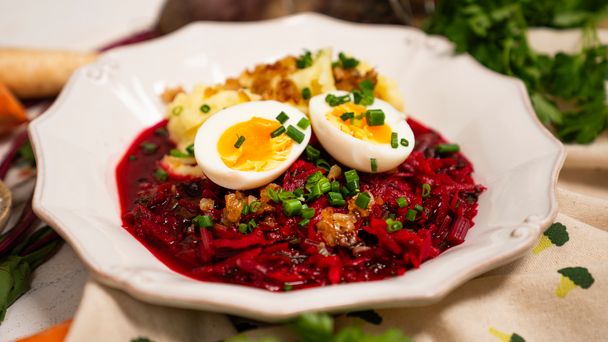 Zupa botwinka na bogato to pełna smaku i kolorów wersja klasycznej zupy z młodych buraczków. Przygotowana na aromatycznym bulionie, z dodatkiem marchewki, pietruszki, czosnku i masła, nabiera wyjątkowej głębi smaku. Dodatek puree ziemniaczanego i jajka sprawia, że to danie jest naprawdę sycące i doskonale sprawdzi się jako pełnowartościowy obiad. Ta zupa z botwinki z jajkiem i ziemniakami to pyszna propozycja na wiosenny lub letni posiłek w domowym stylu.