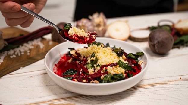 To roślinne curry z botwinką zachwyca świeżością i głębokim smakiem. W daniu wykorzystujemy całe warzywo – od bulw, przez łodygi, aż po liście, które podajemy upieczone jako chrupiący topping. Połączenie botwinki z mleczkiem kokosowym, imbirem i curry tworzy egzotyczną kompozycję, której trudno się oprzeć! Składniki na 4 porcje: 400 g botwinki, 2 łyżki oleju kokosowego(do polania liści), 1/2 łyżeczki soli, 2 łyżki oleju kokosowego (do smażenia), 1 mała cebula, 2 ząbki czosnku, 3 cm świeżego imbiru - tarty, 1 łyżeczka curry