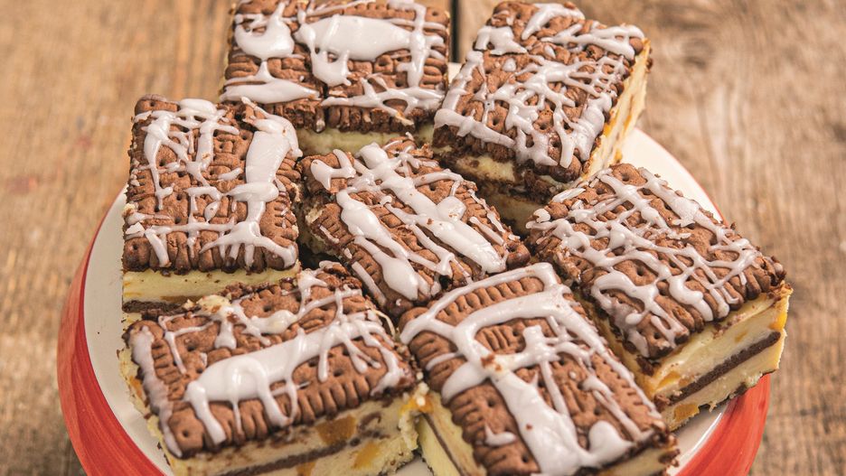 Brzoskwinie odsącz z zalewy i pokrój w kostkę. Jedną szklankę mleka wlej do budyni i rozpuść (na zimno). Do rondelka wlej pozostałe 4 szklanki mleka, wsyp cukier, dodaj masło. Gdy się zagotuje, wlej uprzednio rozpuszczony budyń i wymieszaj. Pokrojone brzoskwinie dodaj do ugotowanego budyniu i znów wymieszaj. Dno blachy o wymiarach 22×32 cm wyłóż papierem do pieczenia i ułóż pierwszą warstwę ciastek. Na nie wyłóż połowę masy budyniowej, następnie drugą warstwę ciastek, a na nie drugą połowę masy budyniowej. Wierzch przykryj trzecią warstwą ciastek. Przygotuj lukier, czyli cukier puder wymieszaj z gorącą wodą. Na końcu całość polukruj. Ciasto włóż na 2 godz. do lodówki.