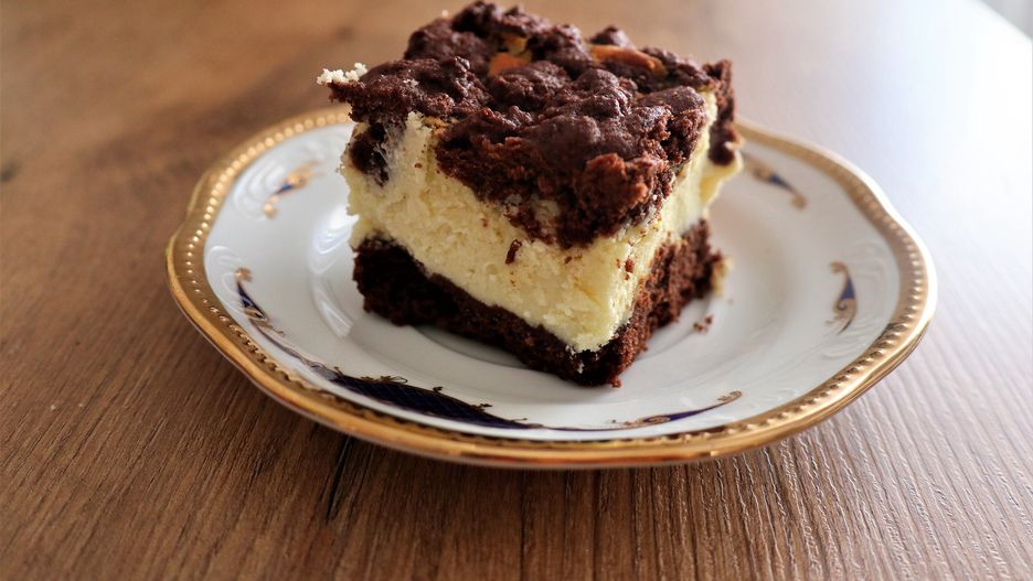 - Masę serową kłaść łyżką w formie kleksów na cieście kakaowym. Można także użyć rękawa cukierniczego i przy jego pomocy równomiernie rozłożyć masę serową w formie kratki.