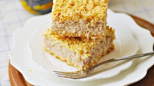 Pełne wiórków kokosowych i jogurtu. Spód i wierzch ciasta zrobiony jest z kruszonki. Jak przyznaje Natalia Kudela, autorka wypieku i bloga "Mała Cukierenka", po raz pierwszy robiła takie ciekawe nadzienie do pieczonego ciasta. Smak w dużej mierze zależy od jogurtu, jaki wybierzemy. Może to być brzoskwiniowo-truskawkowa propozycja lub połączenie preferowane przez czytelniczkę, np. zestawienie wiśni i marakui.