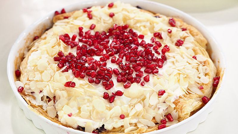 Piekarnik nastaw na 180 stopni. Formę do tarty wyłóż papierem do pieczenia. Połóż na nią ciasto francuskie, nakłuj widelcem i zapiekaj w piekarniku około 15 minut. Po wyjęciu z piekarnika pozostaw do ostygnięcia. Wymieszaj serek z cytryną i cukrem. Śmietanę ubij na puch i dodaj do serka. Na ostudzone ciasto wyłóż dżem z czarnej porzeczki. Następnie przykryj go warstwą serka mascarpone i udekoruj granatem oraz migdałami. Wstaw do lodówki na 2 godziny.