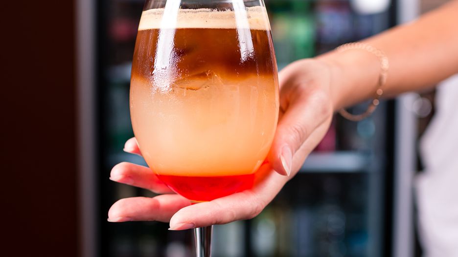 - Do wysokiej szklanki wypełnionej lodem wlej wszystkie składniki.
