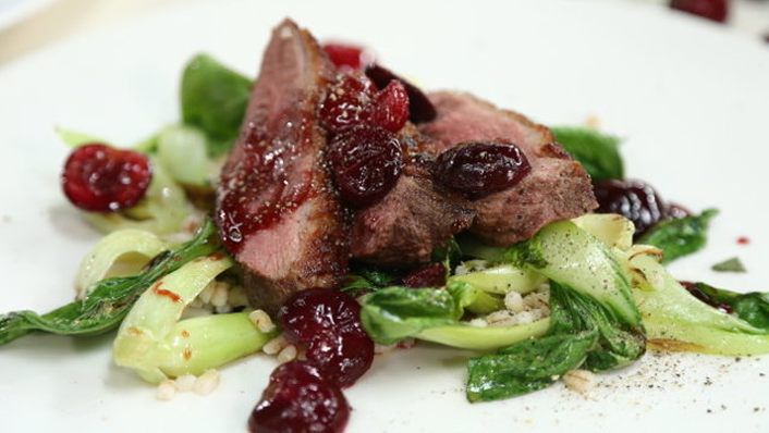 Przygotowanie: pierś gęsi oczyścić i naciąć skórę tak, aby nie uszkodzić mięsa. Wstawić kaszę zgodnie z instrukcją i gotować do momentu aż będzie sprężysta. Pierś smażyć zaczynając od strony skóry. Ok. 8 minut od strony skóry i ok. 2 minut od strony mięsa. Przygotować sos. Podsmażyć cebulę, a gdy będzie już złota zalać ją winem. Wrzucić wypestkowane, przekrojone na pół czereśnie. Zaciągnąć zimnym masłem, dodać sól i pieprz do smaku. Na patelni podsmażyć 1 centymetrowe plastry pak-choi z odrobiną czosnku. Łączyć go z ugotowaną kaszą pęczak, dodać śmietanę. Całość podsmażyć na patelni. Gotowy pęczak ułożyć na talerzu, na nim usmażoną pierś z gęsi i czereśniowy sos.