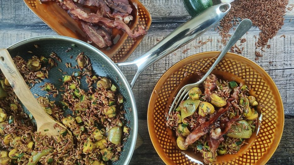 Czerwony ryż z boczkiem i cukinią. Obiad palce lizać