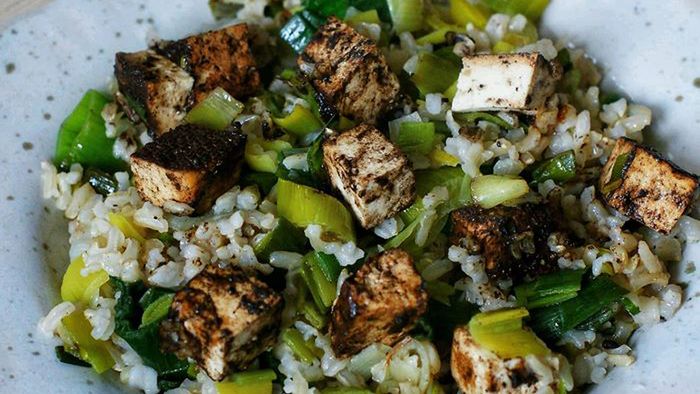 Czosnkowe tofu z brązowym ryżem i porem