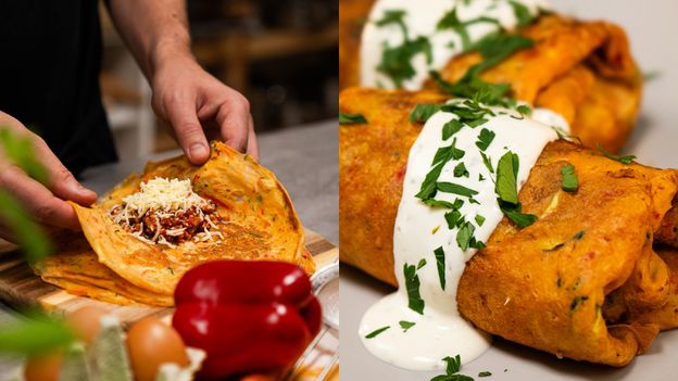 Zaskocz swoich bliskich zupełnie nowym pomysłem na roladki naleśnikowe. Bezpośrednio do ciasta dodaj kolorowe warzywa, a po usmażeniu placków nadziej je mięsno-pomidorowym farszem z dodatkiem mozzarelli. Serwuj od razu po wyjęciu z piekarnika. Lista składników na ciekawy obiad czeka poniżej. Dokładną instrukcję znajdziesz w naszym wideo.