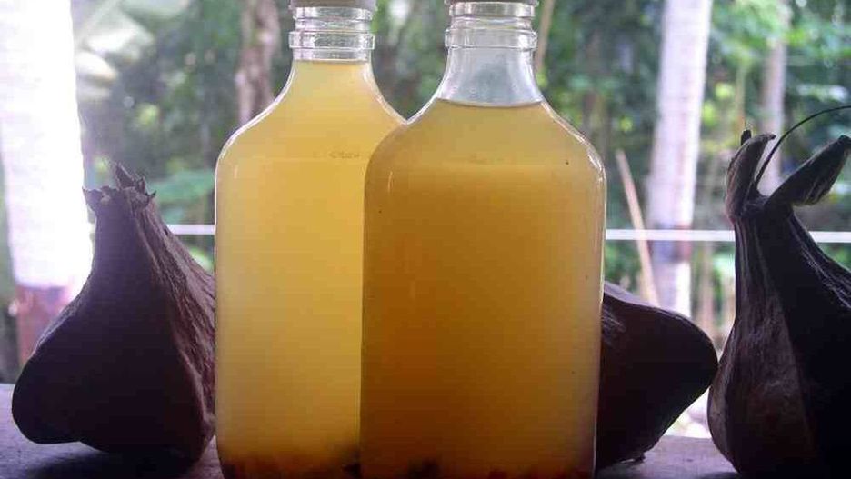 Wykonanie: 2-3 dni wcześniej zalać wiórki kokosowe octem spirytusowym. Następnie orzech kokosa nawiercić na szczycie. Wylać z niego wodę kokosową i przecedzić przez gęstą gazę, by usunąć drobne zanieczyszczenia powstałe podczas nawiercania. Wyskrobać biały miąższ (bielmo) z kokosa i zalać go octem ryżowym.