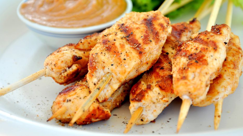 Grillowane kebaby z kurczaka z sałatką rukoli i ciecierzycy