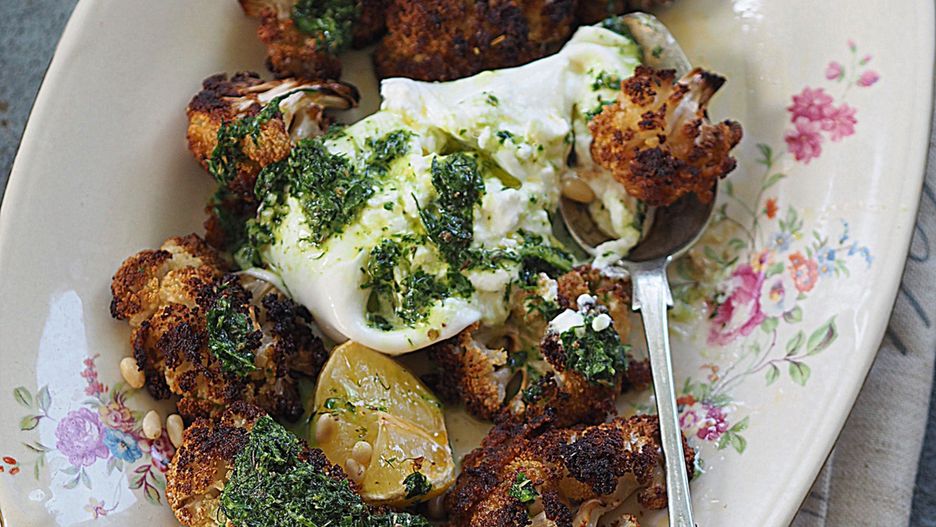 Kalafior pieczony, podany z burratą i ziołowym sosem
