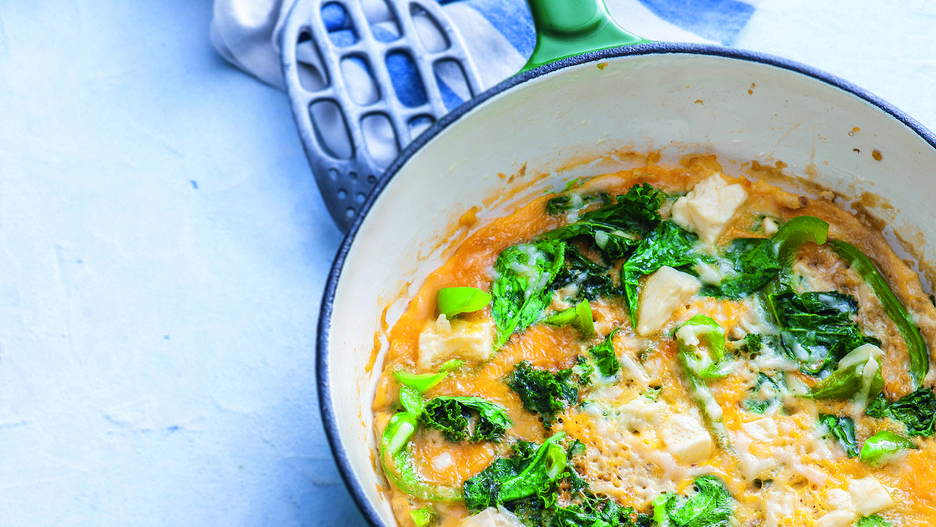 Jajka roztrzepać w miseczce. Paprykę i cebulę pokroić na cienkie plastry. Na patelni rozgrzać olej. Wrzucić pokrojone warzywa, cukier oraz wędzoną paprykę; podsmażać, aż cebula i papryka się zrumienią. Następnie dodać przeciśnięty przez praskę czosnek, liście szpinaku i jarmuż oraz łyżkę wody; smażyć przez 2–3 minuty, mieszając co chwilę, aż liście zmiękną. Po tym czasie wlać przygotowane wcześniej jajka. Patelnię przykryć i smażyć wszystko na małym ogniu. Gdy masa będzie częściowo ścięta, na wierzch dorzucić pokruszony ser feta i przykryć jeszcze na 1–2 minuty. Tak przygotowany omlet przełożyć na talerz, posypać parmezanem i podawać.