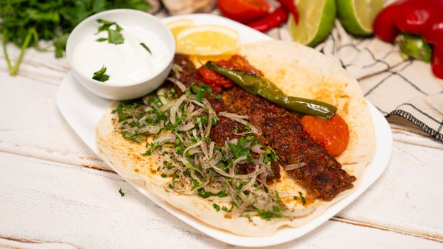 Kebab Adana w lawaszu to popularne danie kuchni tureckiej, składające się z pikantnego mięsa mielonego podawanego w cienkim chlebie lawasz. Jest to często spotykana forma podania, znana również jako "dürüm" (zawinięty).