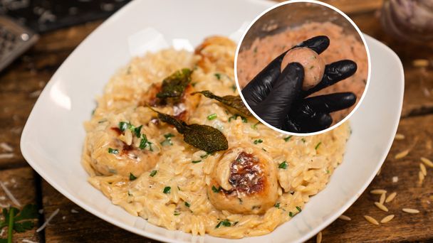 Klopsiki z indyka w połączeniu z makaronem orzo i szałwią to prawdziwa uczta dla podniebienia