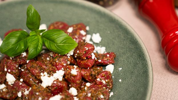 Wyjątkowe gnocchi z botwinką to sezonowa propozycja, która zachwyca kolorem i smakiem. Do ciasta wykorzystujesz ugotowane 250 g ziemniaków i 200 g botwinki (bulwy) – całość mieszasz z 350 g mąki pszennej i 1 łyżeczką soli, formując kluski, które gotujesz przez 2–3 minuty po wypłynięciu. Nie marnujesz nic: z liści i łodyg botwinki przygotowujesz pesto z dodatkiem 70 g pistacji, 2 ząbków czosnku, soku z cytryny, przypraw i oliwy z oliwek (6 łyżek). Całość podajesz z pokruszoną fetą – to lekki, letni obiad pełen koloru.