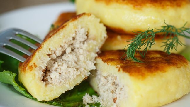 Ugotowane ziemniaki utrzeć z białym serem, dodać przysmażoną cebulę i przyprawy. Z farszu robić małe kuleczki i wrzucać do ciasta. Delikatnie mieszać. Nakładać łyżką na rozgrzany na patelni olej. Smażyć z dwóch stron (powinny być bardzo pulchne). Na stół podajemy z sosem czosnkowym - wszystkie składniki po prostu ze sobą mieszamy.