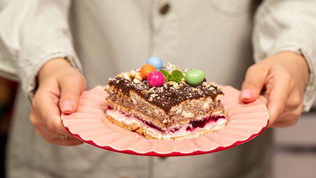 Makowy Królewicz to wyjątkowe ciasto bez pieczenia z mascarpone, herbatnikami i aromatyczną masą makową z bakaliami. Warstwy kremu ze śmietanki 36 proc. i serka mascarpone łączą się z dżemem z czarnej porzeczki, tworząc intensywny, słodko-kwaśny smak. Ciasto układane jest w prostokątnej formie 28x18 cm i chłodzone przez całą noc w lodówce, co zapewnia idealną konsystencję. Na wierzchu dekoracja z pokruszonych herbatników, jajeczek czekoladowych i świeżej mięty dodaje mu świątecznego uroku. To prosty, a jednocześnie efektowny przepis na ciasto bez pieczenia, idealny na święta, spotkania rodzinne lub elegancki deser.