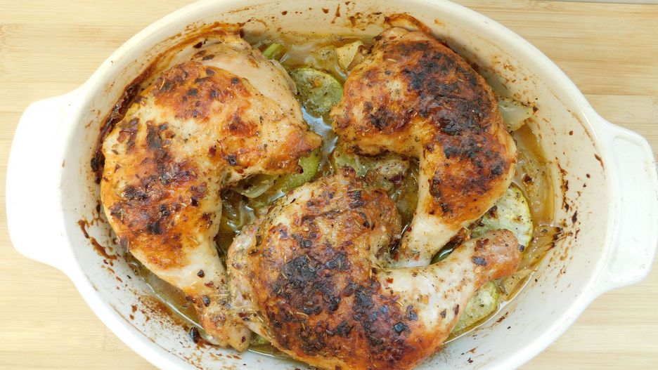 - Przykryć pokrywką i wstawić do piekarnika na 1,5 godziny. Pod koniec pieczenia można zdjąć pokrywkę, by skórka z kurczaka stała się chrupiąca.