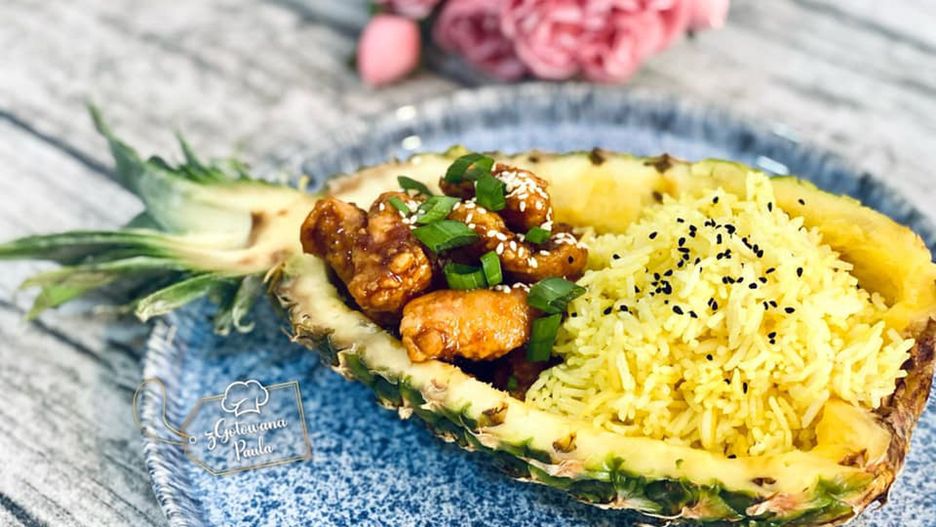 Miękkie kawałki kurczaka w aromatycznym sosie. Do tego ryż jaśminowy i mamy pyszny posiłek w azjatyckim stylu. Danie można podać w wydrążonych połówkach ananasa, wówczas będzie się bardzo efektownie prezentować na stole. Przepis poleca Paulina, autorka bloga "zGotowana Paula".