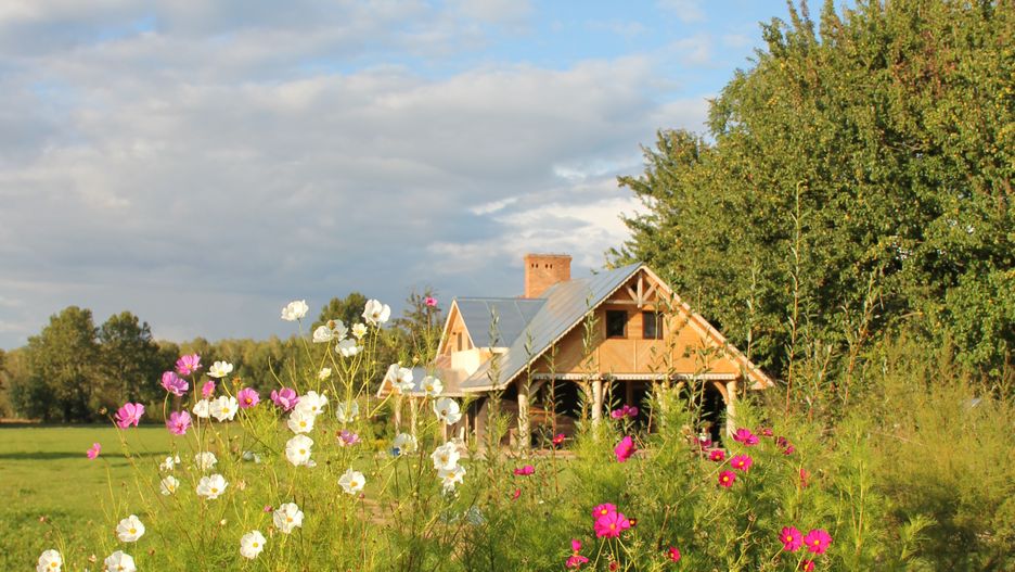 BL: Natomiast ogłoszenie o ziemi pod Kosowem Lackim lakonicznie informowało, że jest do sprzedania ziemia rolna w jednym kawałku. Kiedy dotarliśmy na miejsce, oniemieliśmy. To było to! Okazało się, że działka miała kawałek lasu, ziemię orną oraz przepiękny starodrzew. Jak potem dowiedzieliśmy się od mieszkańców, w tym miejscu przed wojną było gospodarstwo z domem i sadem. Po domu został ledwie dostrzegalny ślad w chaszczach, ale za to rośliny przetrwały. Było dość blisko do najbliższego miasta – 5 km, ale dość daleko od cywilizacji. Na naszym gospodarstwie droga się kończy, dalej jest nieprzejezdna. Odległość od Warszawy to raptem 120 km. Uznaliśmy, że właśnie tu wybudujemy nasz dom, który idealnie wpisze się w krajobraz. Przenieśliśmy dwie stare chałupy z bali, które połączyliśmy w jeden duży dom.