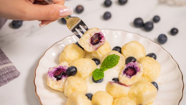 Twarogowe knedle z borówkami to miękkie, lekkie kluski, które zrobisz bez ziemniaków – na bazie twarogu. W środku – soczyste owoce, a na wierzchu – tradycyjnie: śmietana, masło i cukier. Idealne latem, gdy sezon na borówki trwa w najlepsze! Do miski przełóż 275 g twarogu półtłustego, dodaj 1 jajko, 2 łyżki cukru oraz 2 łyżki mąki pszennej tortowej i zagnieć gładkie, miękkie ciasto. Podsypując blat 4 łyżkami mąki, uformuj wałek i podziel go na 23 równe części. Każdy kawałek rozpłaszcz, nałóż do środka kilka borówek (łącznie przygotuj 50 g owoców) i dokładnie zlep, formując kulkę. Knedle gotuj we wrzącej wodzie przez 2–3 minuty od wypłynięcia. Podawaj na ciepło z 3 łyżkami roztopionego masła, 6 łyżkami śmietany 18 proc. i posypką z 2 łyżek cukru. Smakują najlepiej od razu po przygotowaniu – miękkie, owocowe, delikatnie słodkie.