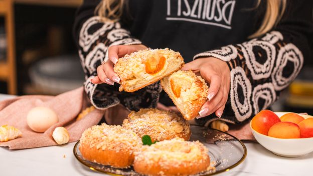 Domowe drożdżówki z morelami to idealna propozycja na letni deser lub słodką przekąskę do kawy. Puszyste ciasto na bazie mąki pszennej, jajek, mleka, cukru i suchych drożdży, z dodatkiem masła i szczypty soli, potrzebuje nieco czasu na wyrośnięcie, ale efekt wynagradza wszystko. W środku znajdziesz aksamitne nadzienie z serka śmietankowego, cukru pudru, jajka i aromatycznej pasty waniliowej, a całość dopełniają połówki świeżych moreli i maślana kruszonka przygotowana z trzech składników: mąki, masła i cukru. Słodycz owoców i lekka kwaskowość doskonale komponują się z waniliowym wnętrzem i delikatnym ciastem.