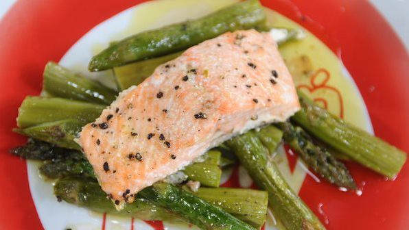 Rozgrzać piekarnik do 160ºC. Łososia oczyścić, przyprawić solą i pieprzem, skropić oliwą z oliwek i ulżyć na blasze do pieczenia. Ze szparagów odciąć 1-2 cm od dołu, skropić oliwą z oliwek, przyprawić solą i pieprzem i ułożyć obok łososia. Wstawić do piekarnika i piec około 20 minut.