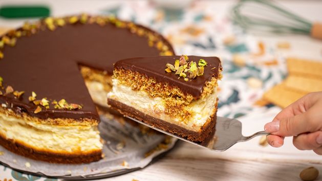 - To jednak nie koniec pracy. Bezpośrednio na upieczonym serniku rozprowadź warstwę z ciasta kataifi i kremu pistacjowego.