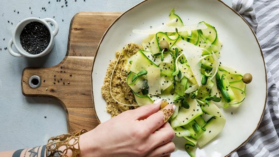 - Następnie wymieszaj pastę z makaronem z cukinii. Podawaj z towarzystwie oliwek, posyp sezamem i dodaj kiełki słonecznika.
