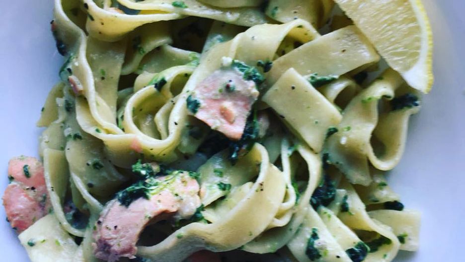 Makaron gotuję al dente, odcedzam. Nie zaszkodzi, jak zostanie trochę wody, świetnie łączy się z sosem. Szpinak podgrzewam na oliwie, dodaję rozgnieciony czosnek, a potem śmietankę. Jak się śmietanka zagotuje, dodaję łososia oddzielonego od skóry i pokrojonego w nieduże kawałki. I tak zostawiam na 5 minut pod pokrywką. Jak łosoś będzie gotowy, dodaję do niego ugotowany makaron, delikatnie mieszam. Doprawiam świeżo mielonym pieprzem i solą. Na talerzach posypuję parmezanem. Dodaję cząstkę cytryny.