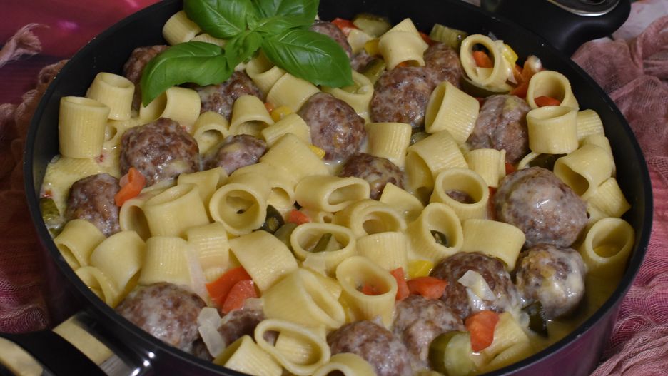 Smaczny pomysł na rodzinny obiad. Mięsne kuleczki i makaron, zatopione w kremowym sosie z warzywami. Do tego solidna porcja żółtego sera. Przepis dostaliśmy na dziejesiewp.pl.