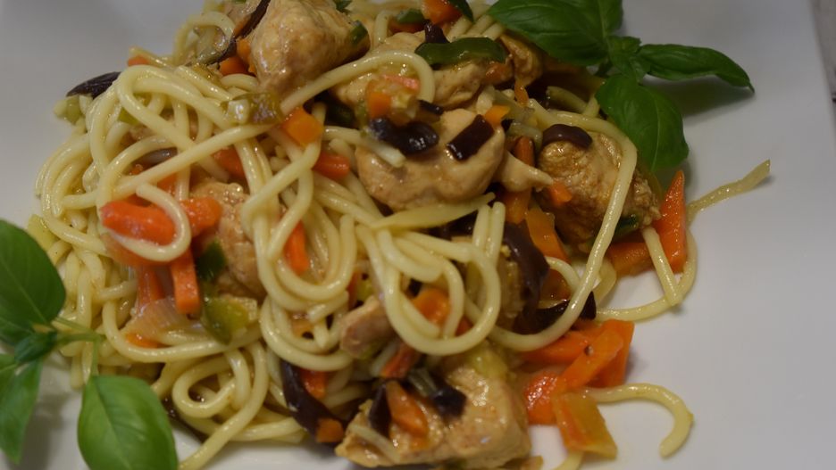 Makaron z warzywami i mięsem po chińsku