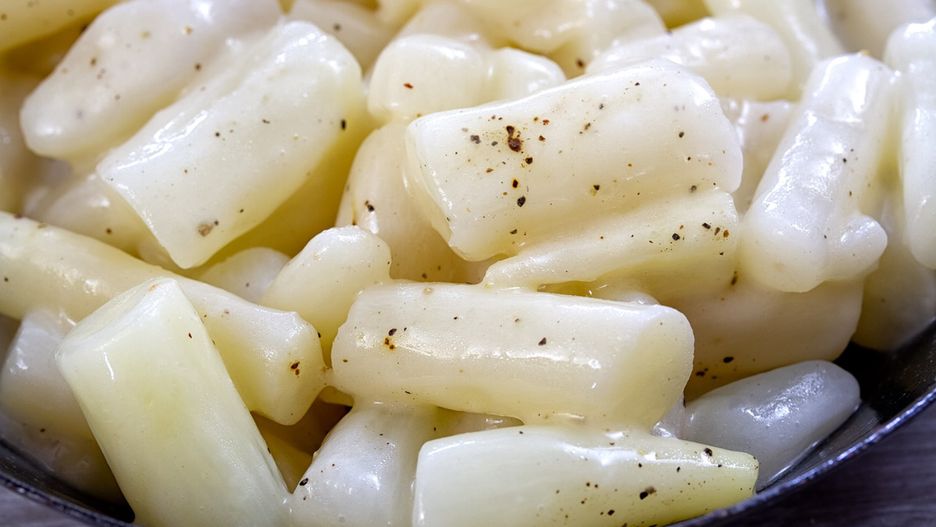 - Obraną salsefię odcedź, pokrój na kawałki o podobnej długości (ok. 5-8 cm). Gotuj w osolonej wodzie z niewielką ilością cukru przez około 20-30 minut, aż będzie miękka, ale wciąż jędrna. Czas zależy od grubości korzeni.