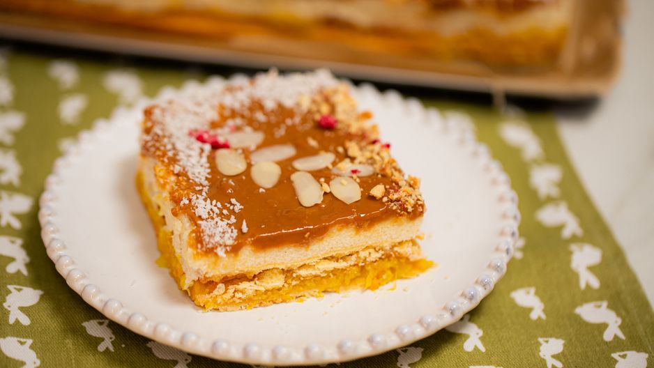Kruche ciasto przełożone pomarańczową masą i kremem grysikowym to pyszna propozycja na świąteczny stół. Mazurek z kaszką manną nie tylko smakuje doskonale, ale też dobrze się kroi - całość nie jest za sucha. Pamiętaj, aby ciasto kruche przed pieczeniem schłodzić i pilnować wypieczenia na złoto (180 stopni Celsjusza, przez ok. 13 minut). Wymiary blaszki to 28x18 cm.