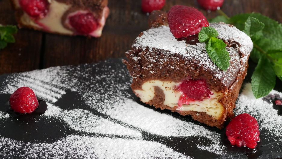 Przepyszny murzynek z kremem jogurtowym i malinami
