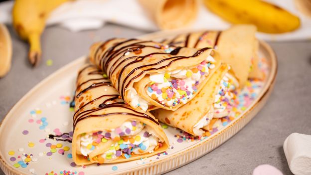 Te naleśniki jak lody rożki to idealny deser dla dzieci i efektowny pomysł na słodkie przyjęcie! Delikatne naleśniki wypełnione kremem ze śmietanki i banana, polane sosem czekoladowym i ozdobione kolorową posypką – wyglądają jak lody, ale nie potrzebujesz zamrażarki! Szybki, prosty i efektowny przepis.