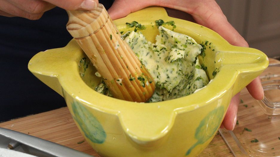 W moździerzu wymieszać przeciśnięty przez praskę czosnek, drobno posiekaną natkę pietruszki i sól. Lekko utłuc. Dodać miękkie masło i dobrze rozetrzeć. Przełożyć do małego naczynia i udekorować natką pietruszki.
