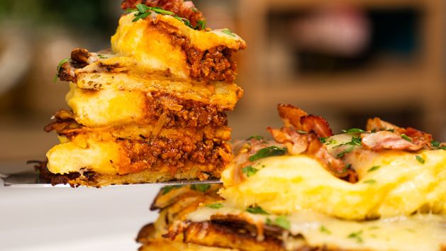 Tego jeszcze u nas nie było. W jednym przepisie przygotowaliśmy ziemniakami w 3 różnych wariantach. Każdy z nich ma coś ciekawego do zaoferowania. A to jeszcze nie koniec niespodzianek na dziś. Idealnym uzupełnieniem ziemniaczanego dania będzie gęsty farsz z wołowiną i sosem pomidorowym. Na uwagę zasługuje też sama forma podania. Dokładna instrukcja czeka w naszym wideo. Listę składników znajdziesz poniżej.