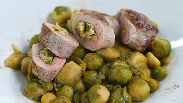 Polędwiczkę podzielić na 2 części i ostrym długim nożem zrobić wzdłuż wgłębienie. Por przekroić, drobno posiekać i poddusić na maśle, pod koniec dodać starte na tarce jabłko. Przyprawić solą i pieprzem, następnie nafaszerować polędwiczki. Polędwiczki obsmażyć na patelni z każdej strony i dopiec w piekarniku. W tym czasie gotować przez około 10 minut polędwiczkę w osolonej wodzie. Na dużej patelni rozgrzać miód i dodać obgotowane brukselki. W trakcie podsmażania na miodzie, przyprawić cynamonem. Polędwiczki podawać z brukselką.
