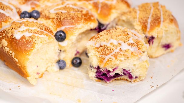 Odrywane bułeczki drożdżowe wypełnione po brzegi borówkami. Z dodatkiem kruszonki i lukru