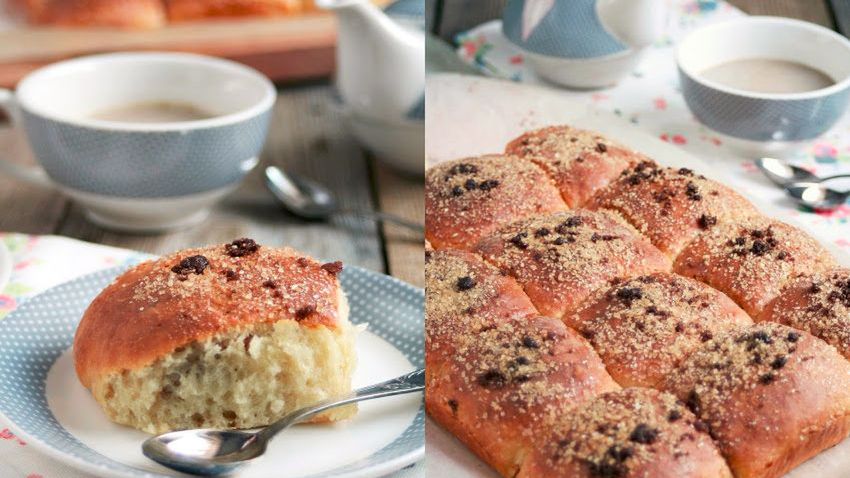 Bułeczki odstawić przykryte czystą ściereczką do podrośnięcia na około pół godziny. Po tym czasie posmarować ich wierzch mlekiem. Najłatwiej użyć do tego celu pędzelka. Posmarowane mlekiem bułeczki obsypać brązowym cukrem - ja użyłam jeszcze dodatkowo cukru muscovado, który nadaje ciekawego, lekko orzechowego posmaku.
