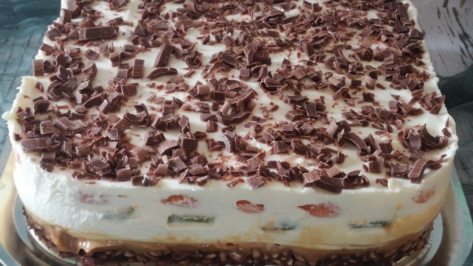 Składniki na spód przekładamy do rondelka, czekolady, miód, nutelle, masło, śmietanę i gotujemy do chwili rozpuszczenia, następnie łączymy z ryżem i wylewamy na dno tortownicy 24 cm na 24 cm. Chłodzimy 10 minut w lodówce. Kiedy ryż już stężeje, smarujemy masą kajmakową, a galaretki rozpuszczamy w 1,5 szklanki gorącej wody i odstawiamy do lekkiego stężenia. Śmietany razem ze śnieżką ubijamy mikserem, dodajemy galaretki. Masę dzielimy na trzy części, jedną część wylewamy na masę kajmakową, układamy kiwi pokrojone w plasterki, potem wylewamy drugą część masy i układamy cząstki mandarynek i przykrywamy ostatnią częścią masy. Czekoladę ścieramy na tarce o dużych oczach i posypujemy wierzch ciasta. Ciasto chłodzimy w lodówce przez 2 godziny.