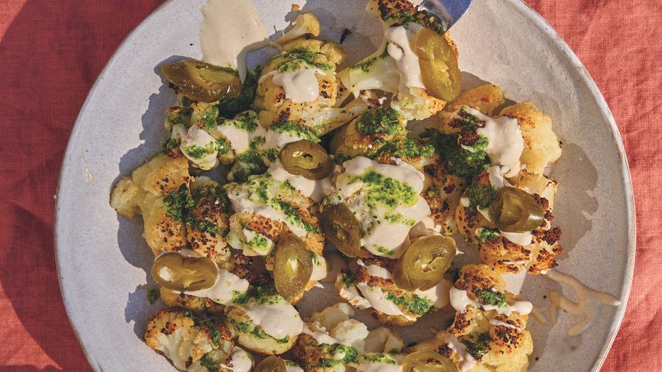 Pieczonego w całości kalafiora spróbowałam pierwszy raz kilka lat temu, podczas krótkiego, szalonego i absolutnie smacznego wypadu do Tel Awiwu. Jednym z miejsc, które znalazły się na planie naszej gastronomicznej marszruty, był Mizon – niewielka, tętniąca życiem i już wówczas bardzo popularna knajpka, której flagowym daniem (choć w pisanym odręcznie menu widniało ich zdecydowanie więcej) były właśnie pieczone w całości kalafiory. Białe głowy tych warzyw zdobiły półki i regały, inne znikały we wnętrzu stojącego w kącie pieca. W końcu jedna trafiła na nasz stół. My dwie, on jeden – gorący, pachnący, z mocno przyrumienionymi różyczkami. Do niego pobrane z parapetu pikle, sosy, wszędobylska tahina, gruba morska sól. To było odkrycie. Pieczonego kalafiora chyba nie da się nie lubić. Jest maślano-orzechowy, chrupiący, a jednocześnie miękki i jędrny. W sytuacji, gdy trzeba wykarmić kilka osób, a nie ma się zbyt wiele czasu na skomplikowane dania, sprawdzi się znakomicie.