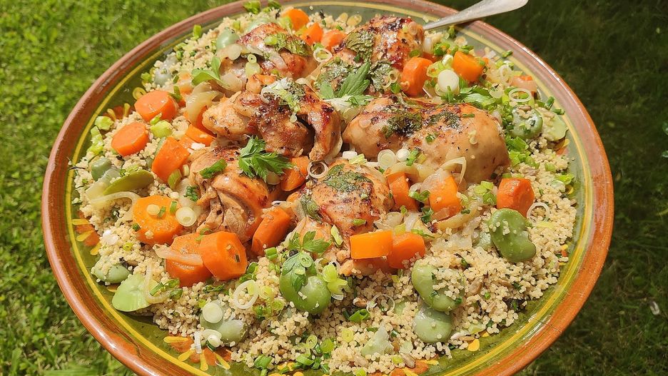 Pieczony kurczak z chrupiącym kuskusem pełnoziarnistym i warzywami