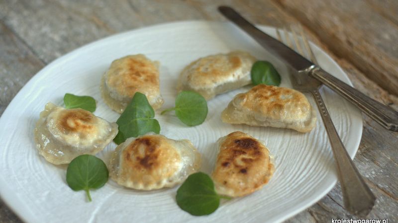 - Ciasto rozwałkować, wycinać koła. Na środek każdego nałożyć trochę farszu. Zlepiać pierogi.
