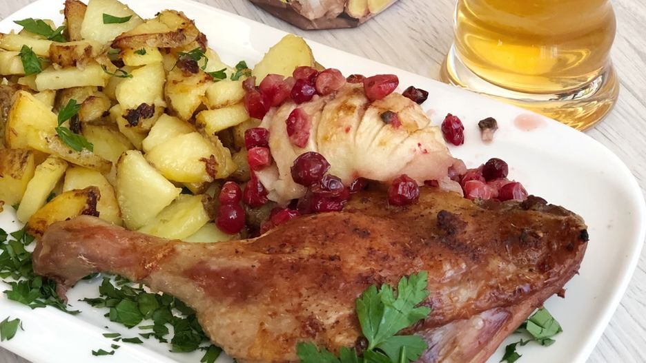 Przygotowanie: udo umyć, osuszyć przyprawić solą i pieprzem oraz wetrzeć w skórkę tarty imbir. Odstawić na 20 min. Naczynie żaroodporne wysmarować olejem, włożyć udo i szczelnie przykryć folią aluminiową. Wstawić do piekarnika nagrzanego do 180 stopni na 40 minut. Jabłko obrać, wydrążyć gniazdo nasienne i ponacinać nożem. Po 50 minutach wyjąć kaczkę z piekarnika, zdjąć folię, zlać tłuszcz, obok uda ułożyć jabłko, posypać żurawiną i całość polać piwem. Naczynie ponownie wstawić do piekarnika już bez przykrycia. Piec ok. 20 minut aż udko ładnie się zarumieni. W tym czasie na wytopionym kaczym tłuszczy usmażyć ziemniaka pokrojonego w kostkę lub półtalarki. Danie na talerzu posypać natką pietruszki. Smacznego.