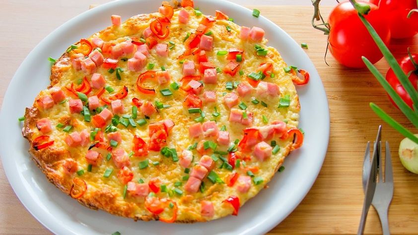 - Na blaszce wyłożonej papierem do pieczenia, układamy tortille, na niej omlet, ser szynkę, pomidory lub inne ulubione dodatki.