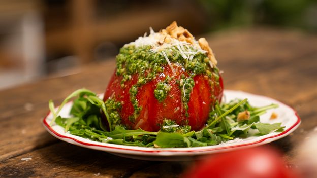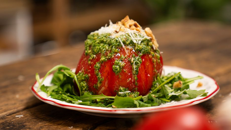 Ten przepis to kwintesencja lata – soczysty pomidor wypełniony kremową burratą, podany na rukoli, z domowym pesto i chrupiącymi orzechami włoskimi. Prosto, szybko i efektownie – idealna przekąska na upalne dni, romantyczną kolację albo eleganckie przyjęcie. Wystarczy kilka składników, by zachwycić gości (i siebie!) wyjątkowym smakiem w śródziemnomorskim stylu. Zrobisz go w mniej niż 15 minut!